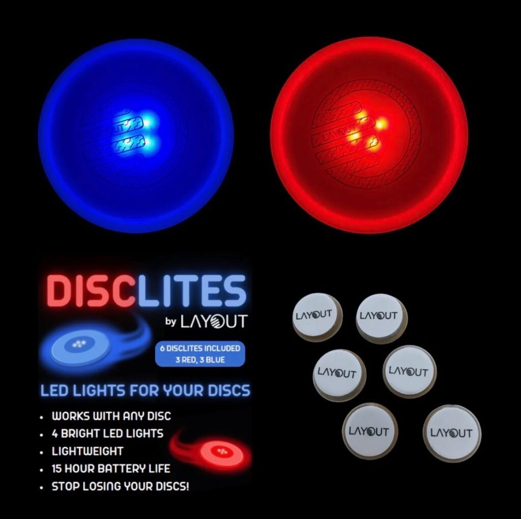 -Layout Disc Golf glow lights: nothing says winter like glow golf. Sure glow tape can work, but Layout Disc Golf glow lights are next level. With a strong adhesive on the back, and multi-functional LED lights…finding your discs in the dark is now easier than ever! Not to mention they look awesome flying through the air!